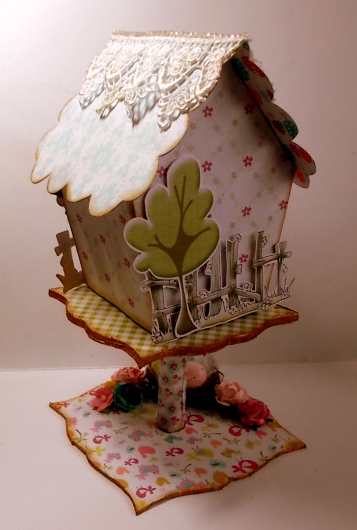 I added lots of flowers, lace, pearl trim and other goodies from my stash and mounted the bird house on MDF shapes that I'd covered with papers from Twiggy and Toots